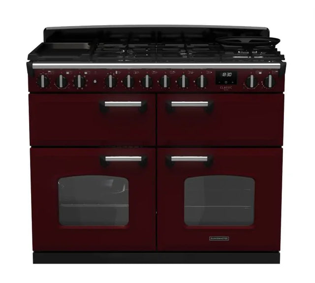 Rangemaster Classic Deluxe 110cm Dual Fuel Range Cooker (Slow Cook) - Bordeaux & Chrome | CLDLB110DFPBOR/CM1 is backordered and will ship as soon as it is back in stock.