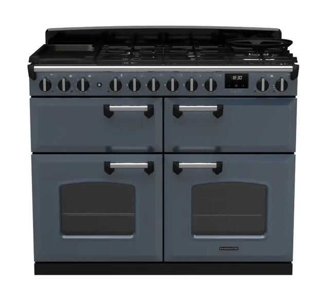 Rangemaster Classic Deluxe 110cm Dual Fuel Range Cooker (Slow Cook) - Stone Blue & Chrome | CLDLB110DFPSTB/CM1