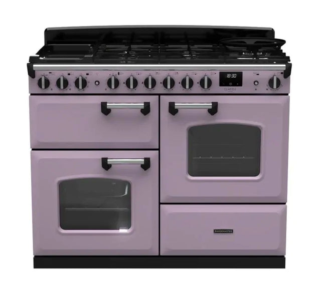 Rangemaster Classic Deluxe 110cm Dual Fuel Range Cooker - Heather & Chrome | CLDLO110DFPHTH/CM1 is backordered and will ship as soon as it is back in stock.