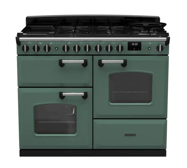 Rangemaster Classic Deluxe 110cm Dual Fuel Range Cooker - Mineral Green & Chrome | CLDLO110DFPMGR/CM1