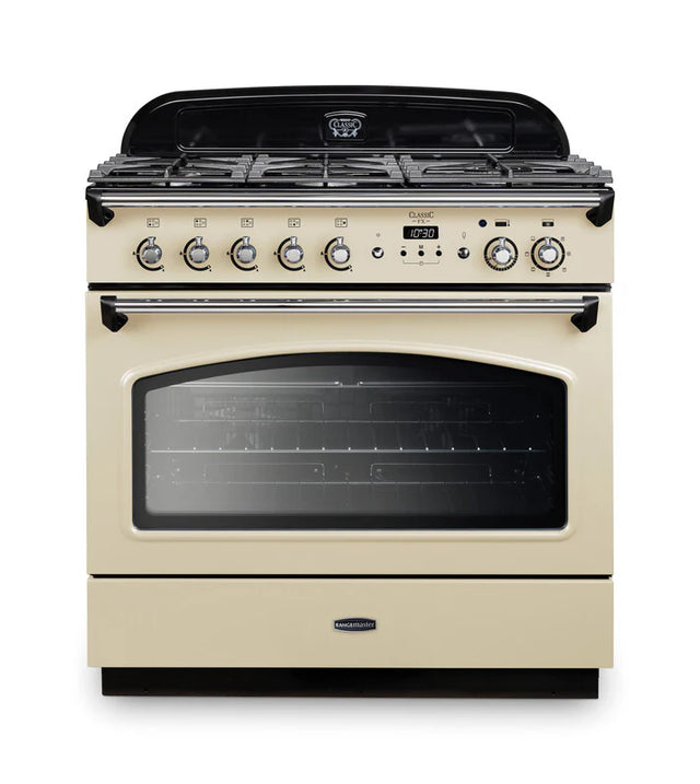Rangemaster Classic FX 90cm Dual Fuel – traditional styling with a spacious 114L fan oven, innovative energy saving panel, and powerful five-burner gas hob.