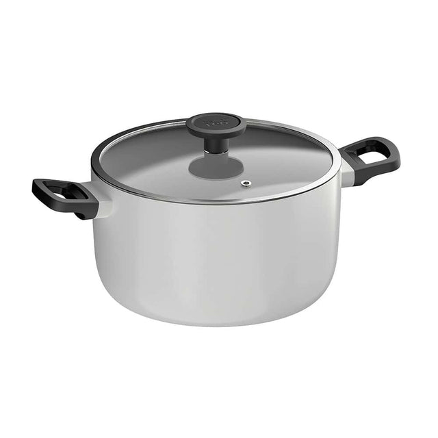 The recycled aluminium covered stockpot is easy to handle thanks to its lightweight. It is equipped with a healthy and sustainable non-stick coating for easily food release and clean up, but provides you with the convenience of using little to no oil. The glass lid with stainless steel rim and venting hole ensures you of keeping an eye on the food while cooking. The stylish look of this stockpot will give your kitchen a modern update.