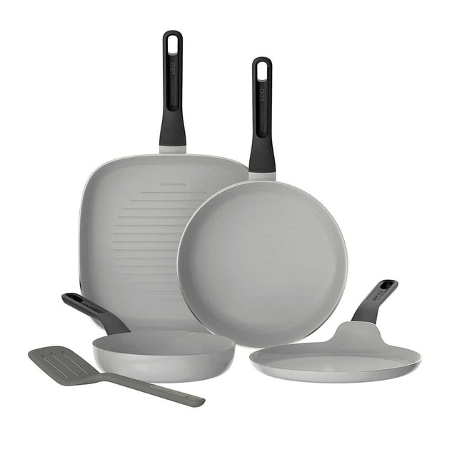 These ideally sized frying pans (20cm and 24cm) are made to help you prepare your breakfast in the morning or your dinner in the evening. The stunning grill pan (26cm) is the perfect companion for your favourite searing dishes, while the pancake pan (24cm) will help you prepare a hearty or sweet treat! The recycled aluminium body ensures great and even heat distribution, ideal for roasting, searing and browning food. The high-quality and healthy non-stick coating means you need little to no oil and the pan is easy to clean. The stay-cool phenolic handles ensure you can safely carry the pan from the cooktop to the table. The pans are also suitable for all cooktops, including induction. A free turner made with recycled plastic gives you the best cooking results!
