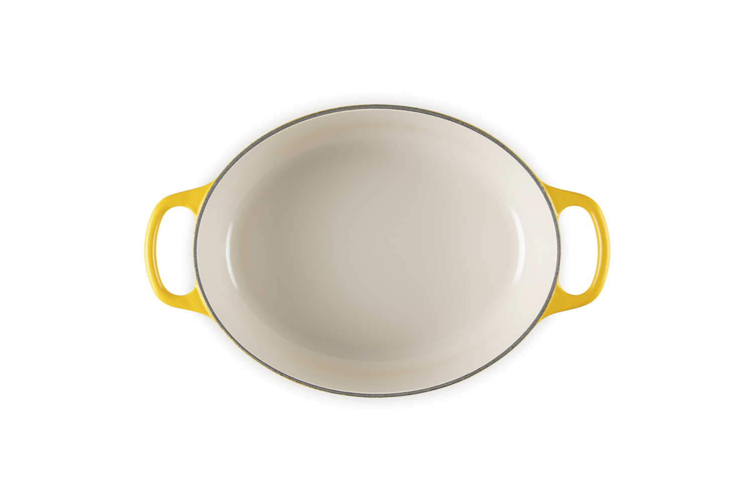 Le Creuset oval cast iron casserole, perfect for roasting, slow cooking, and baking with excellent heat retention and moisture locking design.