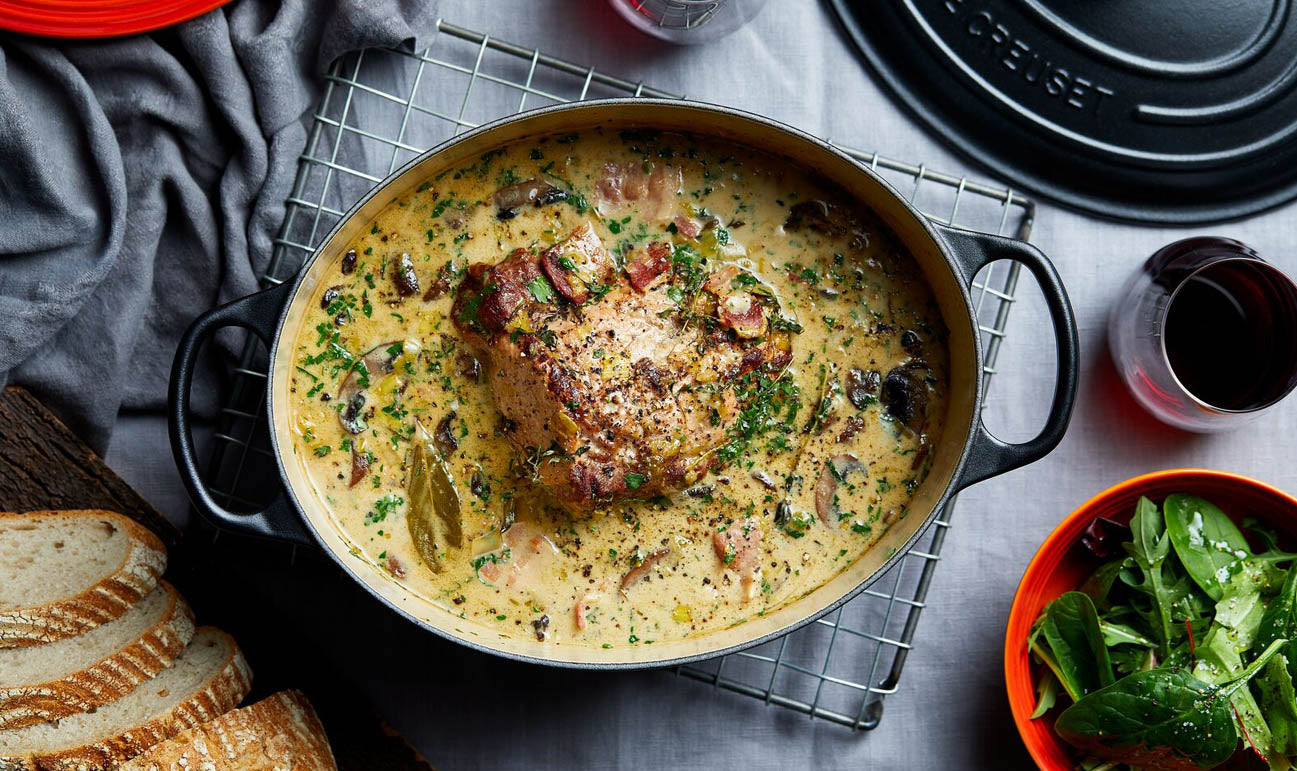 Le Creuset oval cast iron casserole, perfect for roasting, slow cooking, and baking with excellent heat retention and moisture locking design.