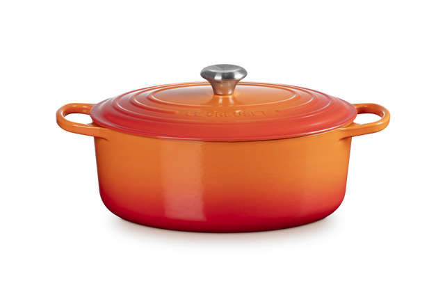 Le Creuset oval cast iron casserole, perfect for roasting, slow cooking, and baking with excellent heat retention and moisture locking design.