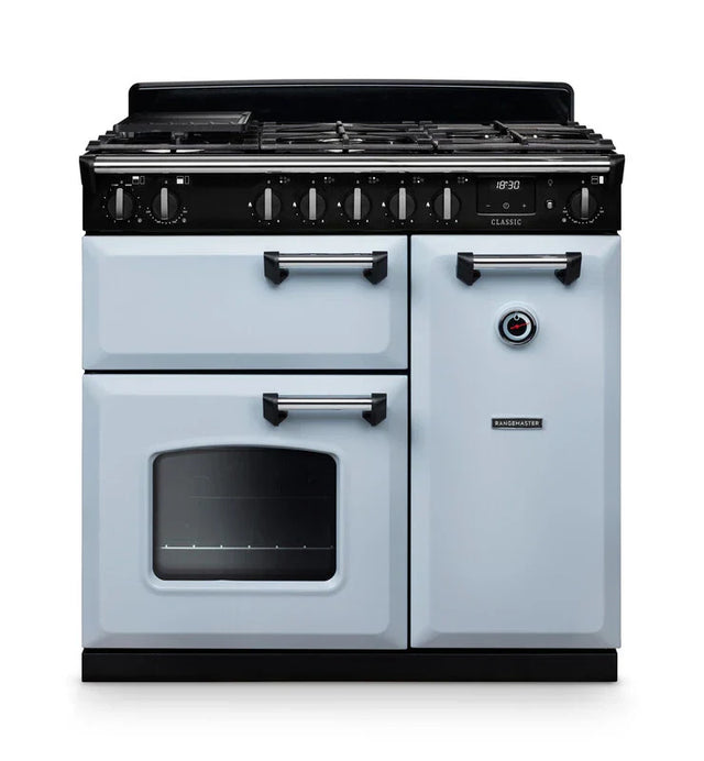 Rangemaster Classic 90cm Dual Fuel Range Cooker - Misty Blue & Chrome | CL90DFPMSB/CM1